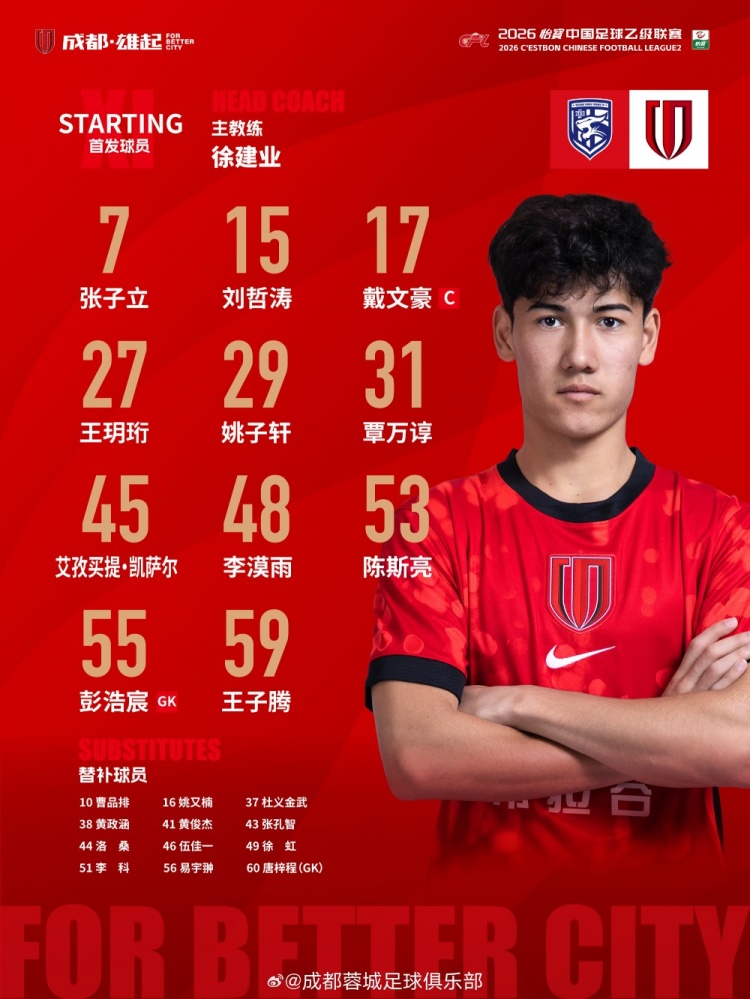 武汉三镇B队对阵成都蓉城希拉谷首发公布